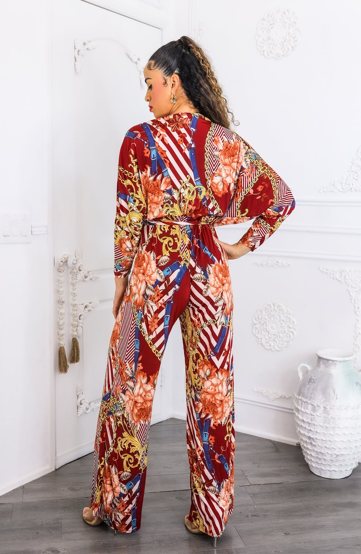 The Red Chain Print Wide Leg Jumpsuit is where bold meets effortless style. With its mix of baroque chain and floral prints in rich red, gold, and navy tones, this piece brings high-fashion energy to your wardrobe. Designed with a relaxed fit through the legs and a flattering tie waist, it creates that easy, flowy silhouette everyone loves.
